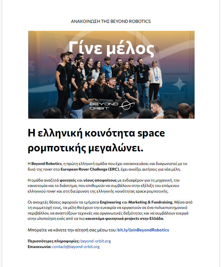 «Η Beyond Robotics, είναι φοιτητική ομάδα στην Ελλάδα που συμμετέχει στον διεθνή διαγωνισμό διαστημικής ρομποτικής European Rover Challenge (ERC), κατασκευάζοντας κάθε χρόνο το δικό της rover με διακρίσεις στις μέχρι τώρα συμμετοχές της ανάμεσα σε περισσότερες από 100 πανεπιστημιακές ομάδες διεθνώς.