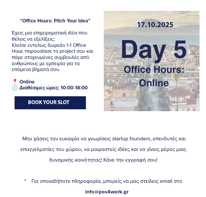 Μαζί μας θα είναι ο Μάριος Βλαχογιάννης (Head of Product & Co-Founder, Coffe-Eco) και ο Ιγνάτιος Φωτίου (President,Tobea) οι οποίοι μαζί με τον Νάσο Κοσκινά (Founder & CEO, POS4work Innovation Hub) θα αναλύσουν τα βήματα που χρειάζονται για να μετατραπεί μια ιδέα σε επιτυχημένη startup, θα μοιραστούν εμπειρίες από το οικοσύστημα και θα δώσουν χρήσιμες πληροφορίες και πρακτικές συμβουλές σε όσους θέλουν να κάνουν το επόμενο βήμα.